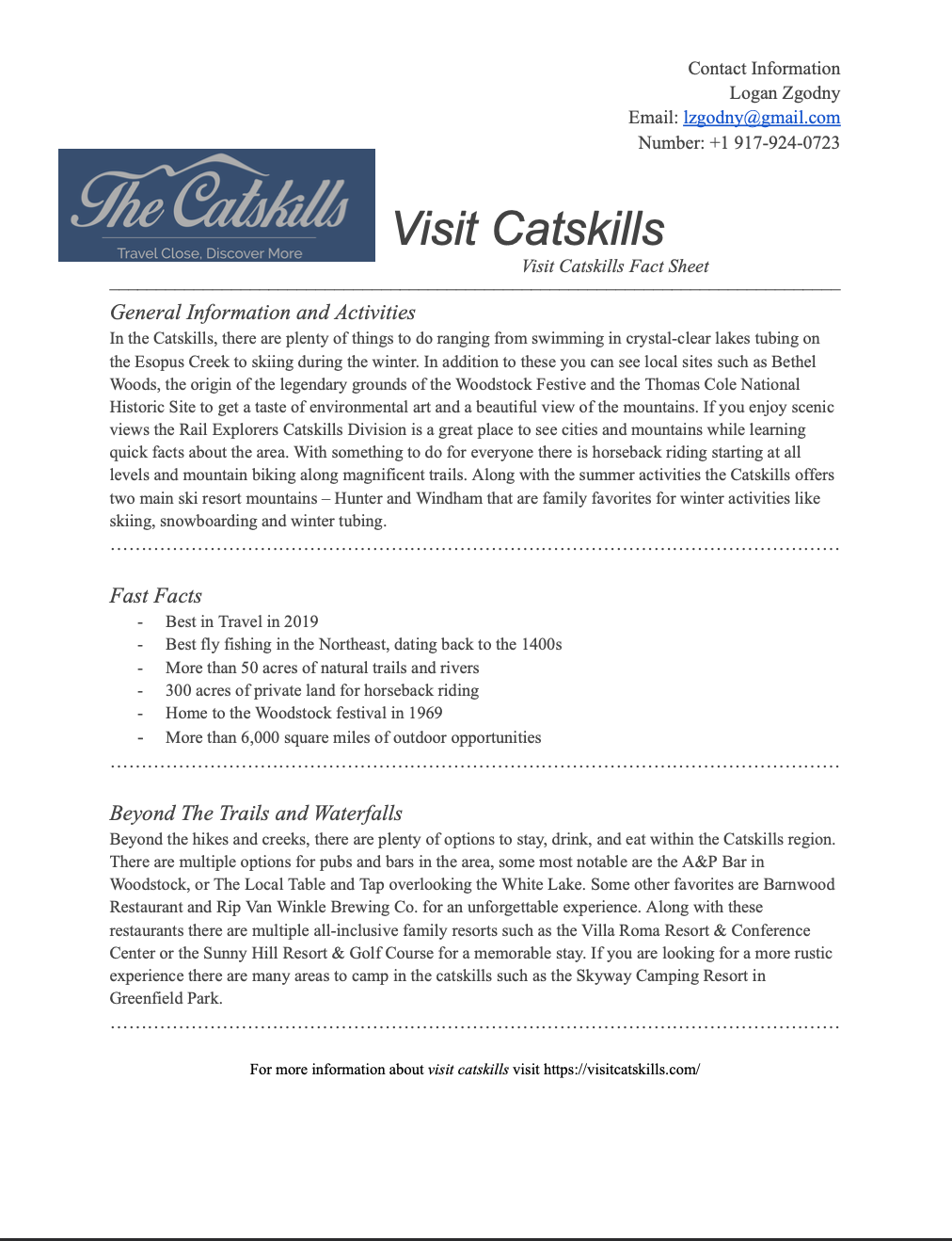 Here is a mock Fact Sheet for the company Visit Catskills that was done in my PR writing class.