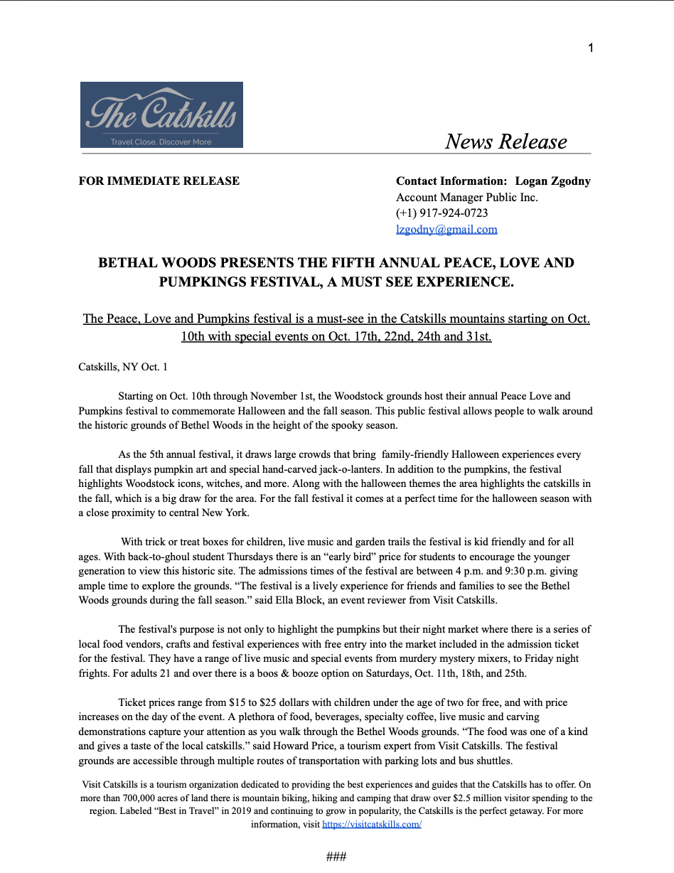 Here is a mock Press Release for the company Visit Catskills that was done in my PR writing class.